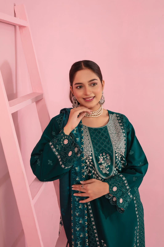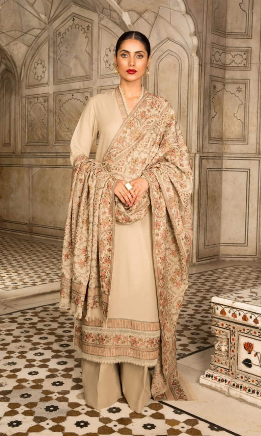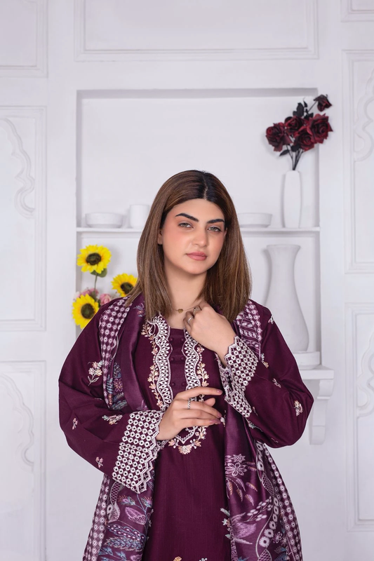 Unstitched 3pcEmbroidered Full FrontEmbroidered SleevesDhanakEmbroidered shawlPlain TrouserFree Delivery in 4-5 days